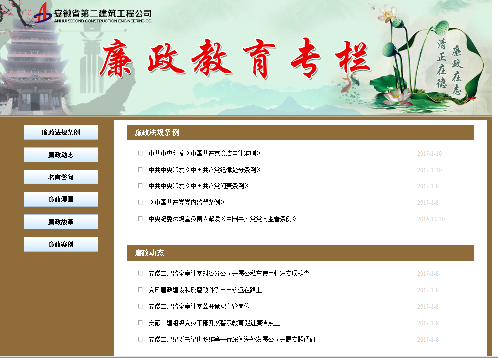 為實現(xiàn)廉政教育工作日常化、動態(tài)化,同時結(jié)合省國資委、集團紀委工作要求,經(jīng)過前期的創(chuàng)意和材料收集,在信息部的大力支持下,公司紀委《廉政教育專欄》于2017年1月10日正式上線。