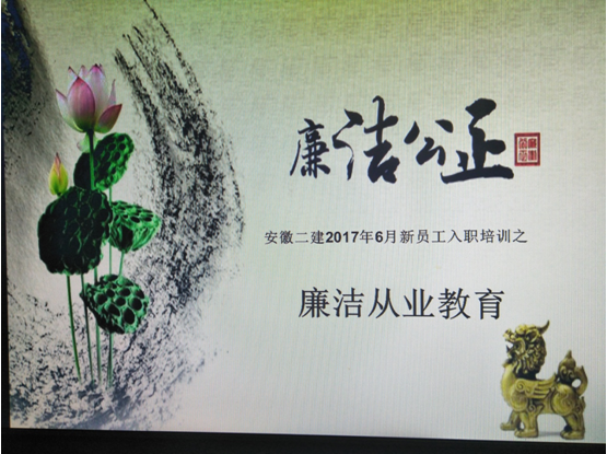 6月19日,安徽二建紀委對新入職員工進行了崗前廉潔從業教育培訓,首次將廉潔自律作為走上新崗位的第一課,引導和加強新員工在思想上牢固樹立“廉潔從業,遵紀守法”的廉潔意識,提高廉潔自律的辨識能力和自我約束力。