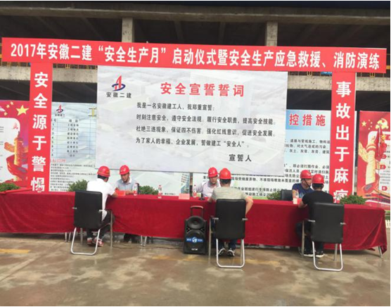 2017年6月8日上午,由安徽二建承建的太和發(fā)藝時尚文化園公共服務中心項目開展2017年“安全生產(chǎn)月”啟動儀式暨安全生產(chǎn)應急救援、消防演練活動,正式拉開了以“全面落實企業(yè)安全生產(chǎn)主體責任”為主題的安全生產(chǎn)月活動序幕。公司副總經(jīng)理葉和永,安全管理部、工程管理部、保衛(wèi)部、太和PPP項目負責人、班組長、一線作業(yè)施工人員等百余人參加了此次活動。