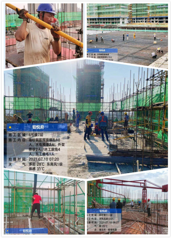 自6月21日公司2021年“學黨史、保安康、搶工期、爭一流”勞動競賽活動啟動后,一分公司淮北鉑悅府項目立即召開動員會,根據勞動競賽目標,梳理各班組施工任務,下達施工任務書,每天召開安全生產例會,檢查當日任務完成情況,總結經驗,及時分析存在的問題,并制定相應糾偏措施,確保完成施工任務。項目全體員工堅定信心、苦干實干、爭分奪秒、大干快干。截止目前,各樓棟形象進度均按勞動競賽計劃完成,7月計劃產值1400萬,實際已完成產值1523萬元,階段性產值目標超額完成。
